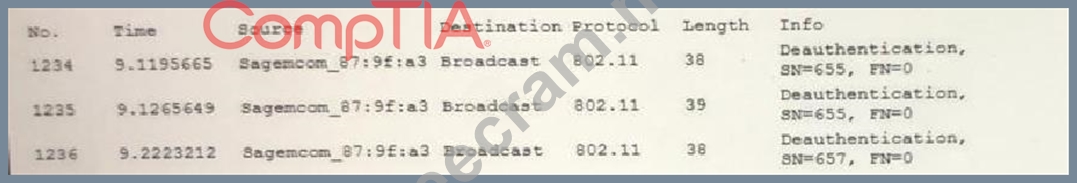 A user reports constant lag and performance issues with the wireless network when working at a local coffee shop. A security analyst walks the user through an installation of Wireshark and get a five-minute pcap to analyze. The analyst observes the following output: