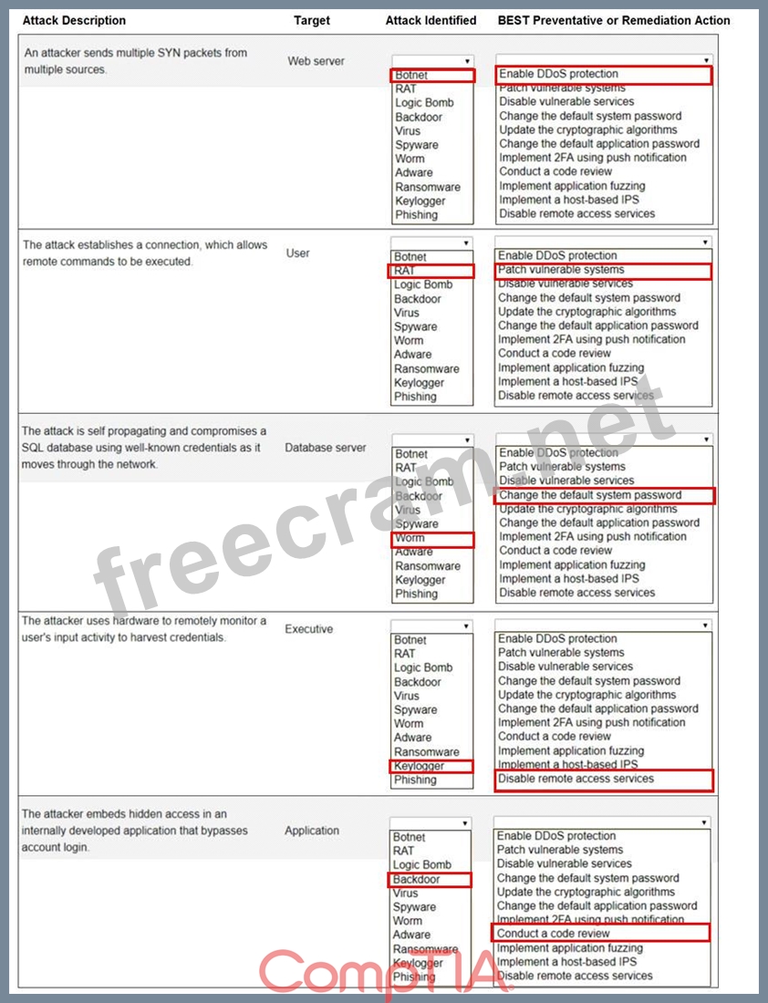 Select the appropriate attack and remediation from each drop-down list to label the corresponding attack with its remediation.