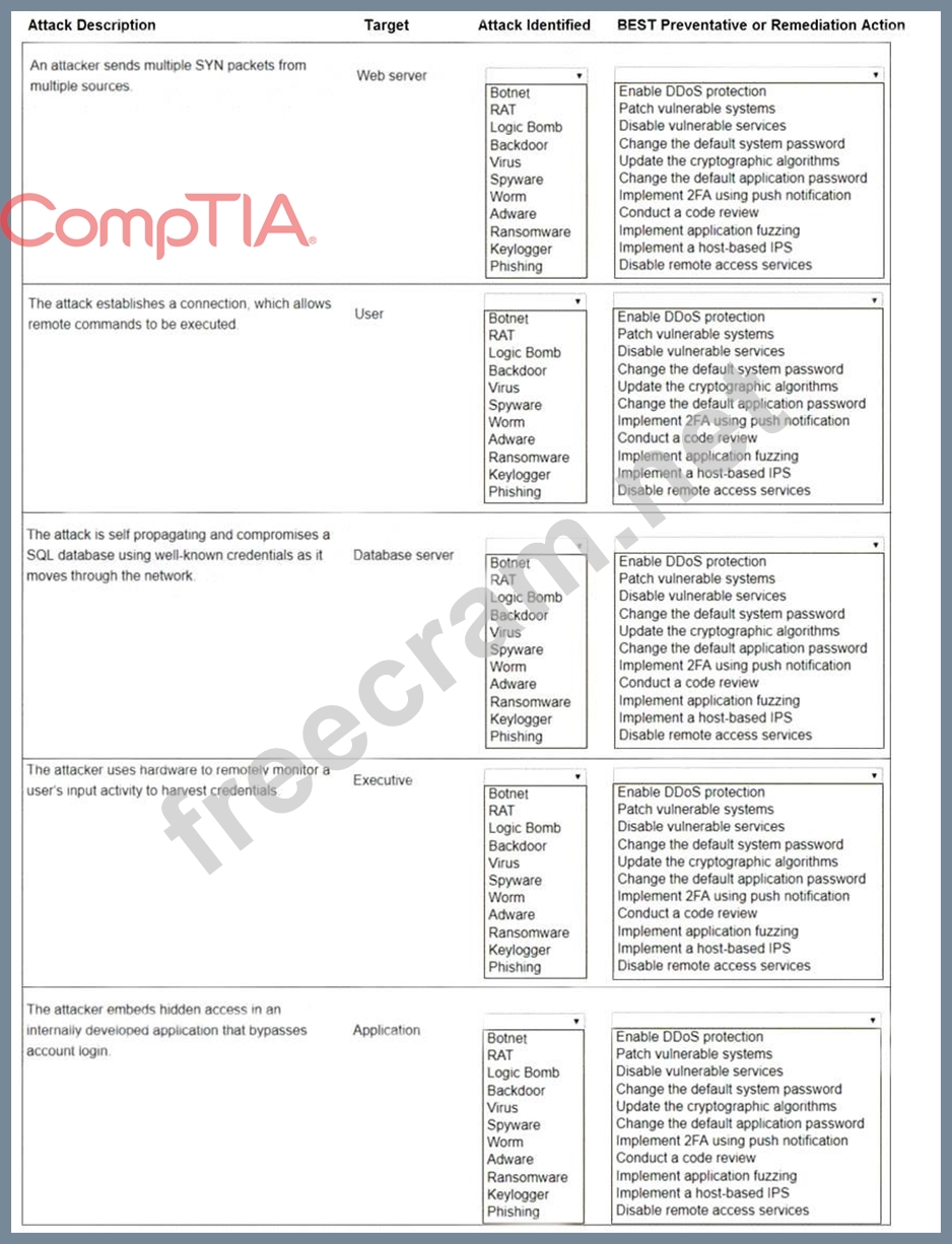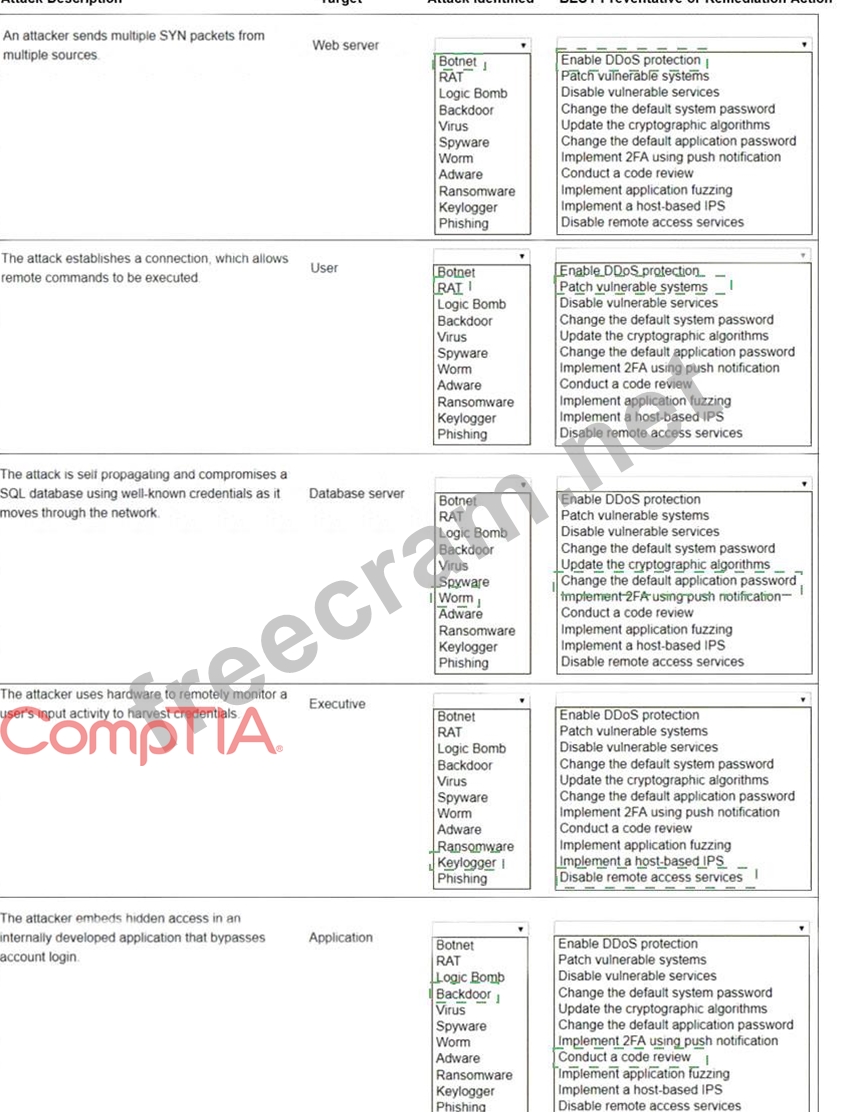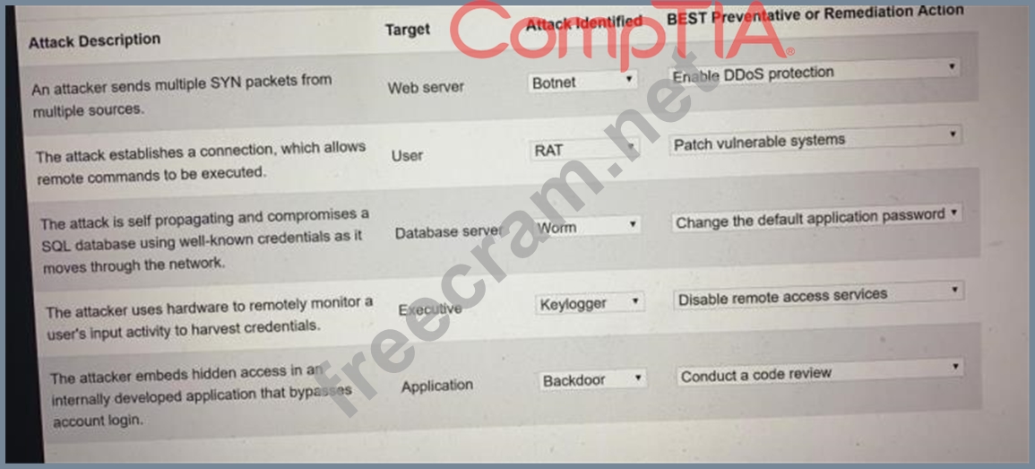 Select the appropriate attack and remediation from each drop-down list to label the corresponding attack with its remediation.