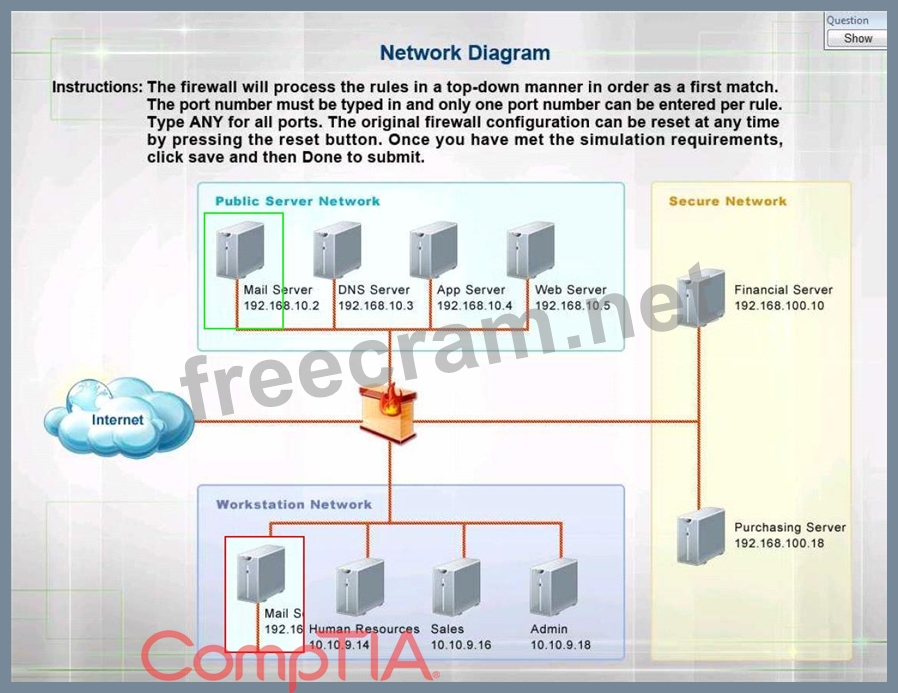 Instructions: The firewall will process the rules in a top-down manner in order as a first match The port number must be typed in and only one port number can be entered per rule Type ANY for all ports. The original firewall configuration can be reset at any time by pressing the reset button. Once you have met the simulation requirements, click save and then Done to submit.