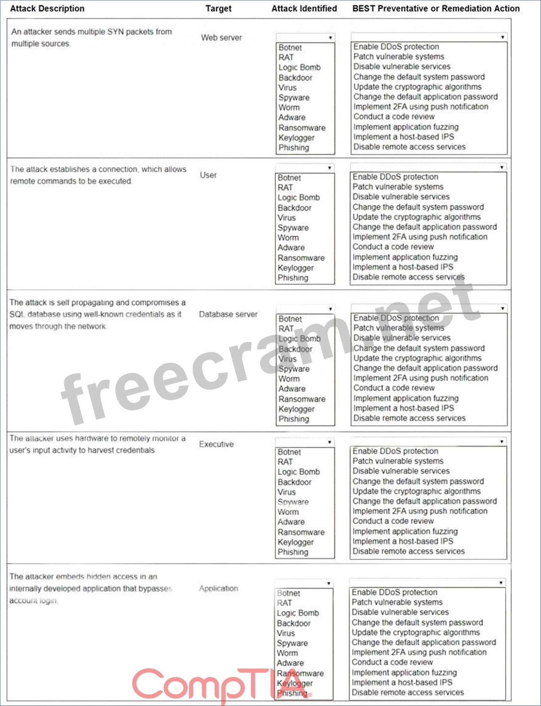 Select the appropriate attack and remediation from each drop-down list to label the corresponding attack with its remediation.