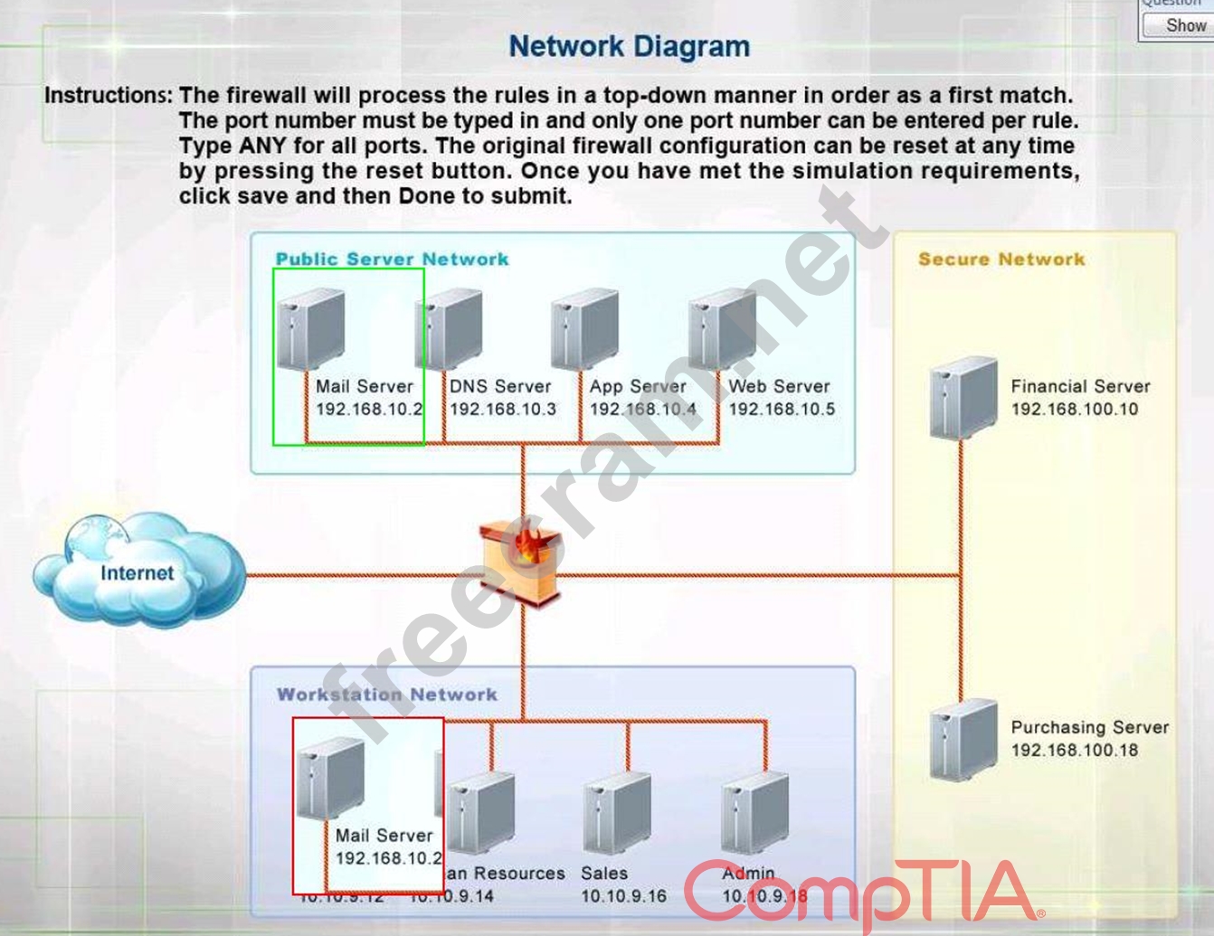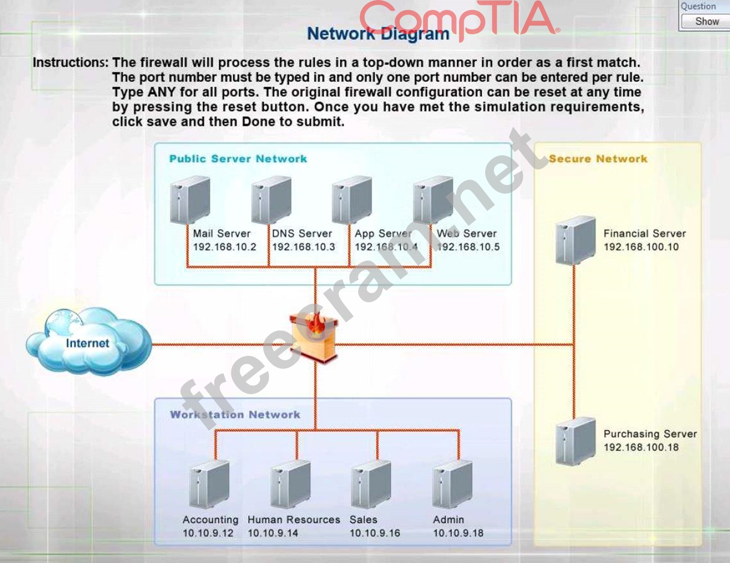 Instructions: The firewall will process the rules in a top-down manner in order as a first match The port number must be typed in and only one port number can be entered per rule Type ANY for all ports. The original firewall configuration can be reset at any time by pressing the reset button. Once you have met the simulation requirements, click save and then Done to submit.