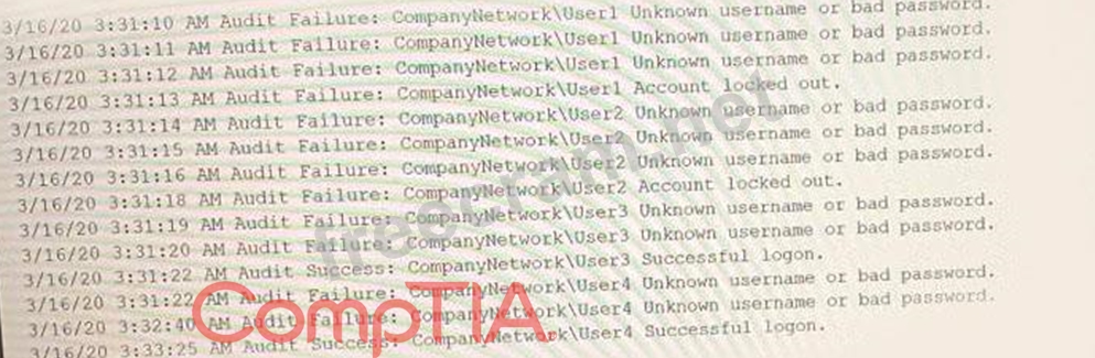 A security analyst needs to determine how an attacker was able to use User3 to gain a foothold within a company's network. The company's lockout policy requires that an account be locked out for a minimum of