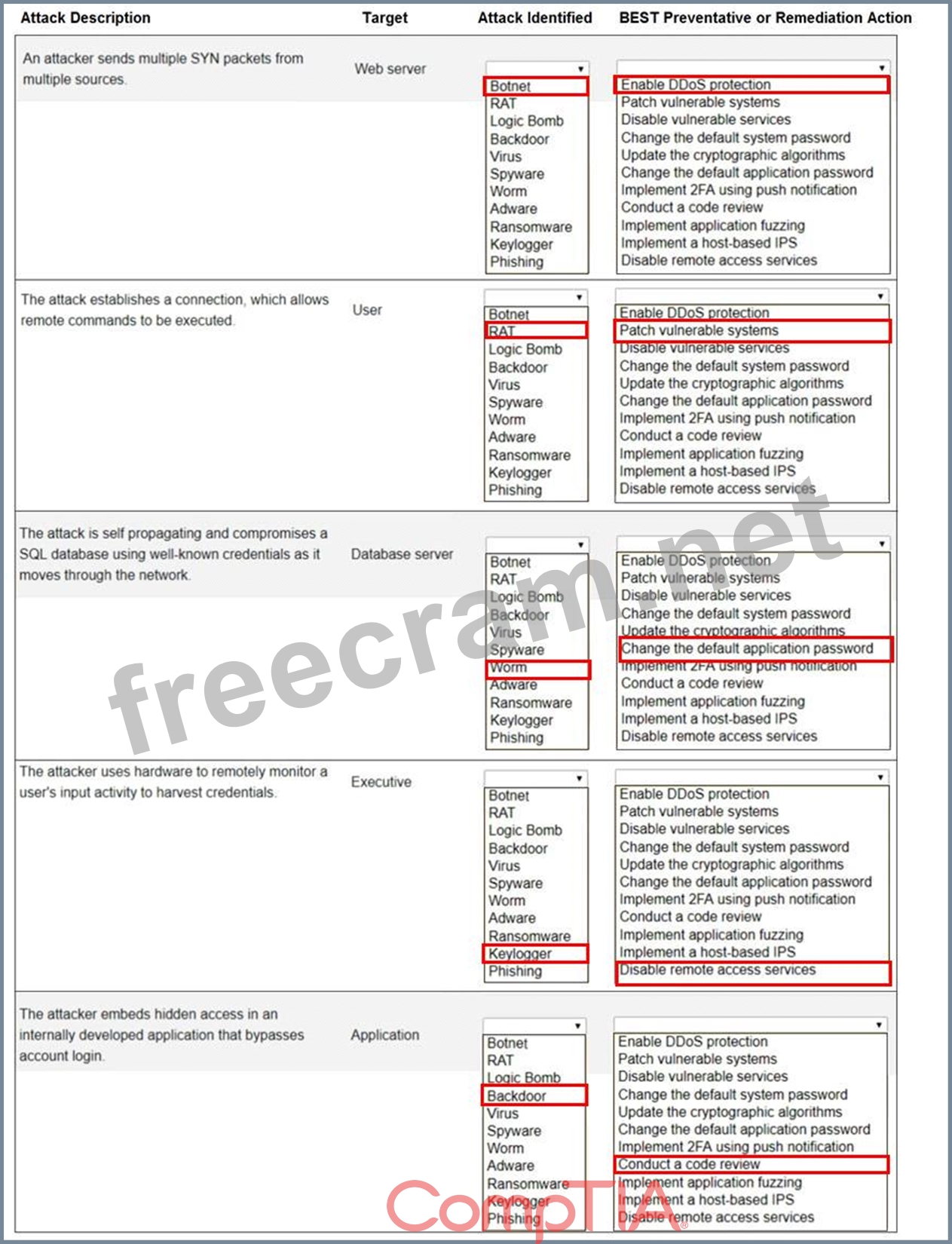 Select the appropriate attack and remediation from each drop-down list to label the corresponding attack with its remediation.