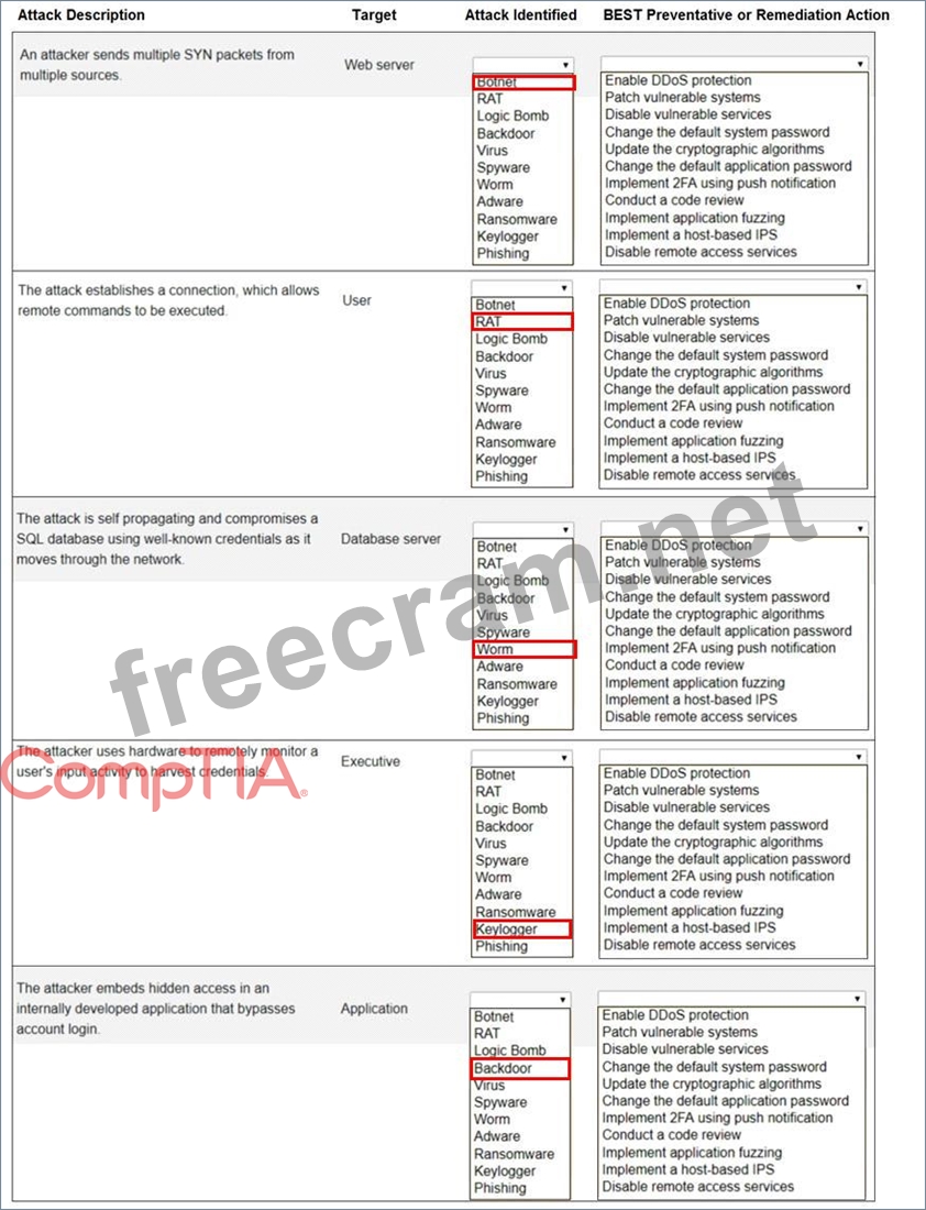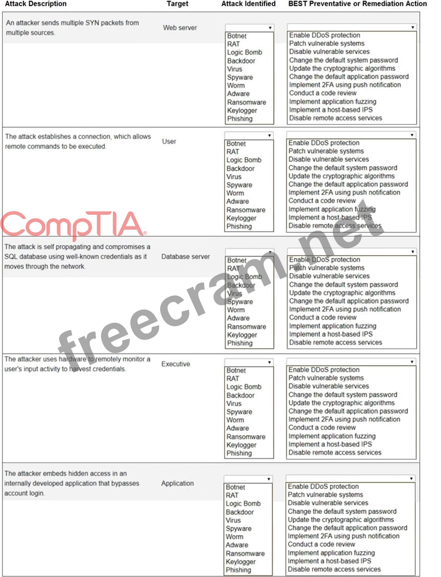 Select the appropriate attack and remediation from each drop-down list to label the corresponding attack with its remediation.