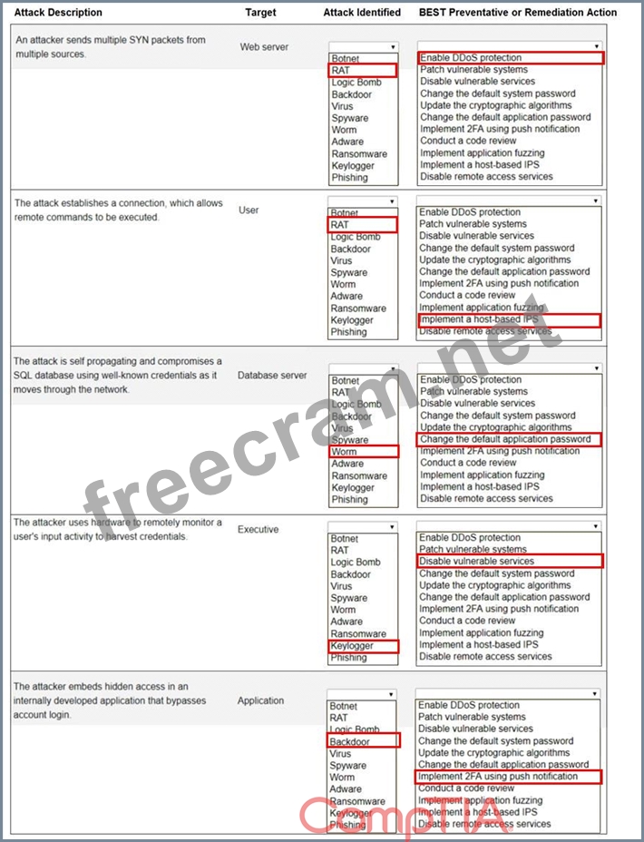 Select the appropriate attack and remediation from each drop-down list to label the corresponding attack with its remediation.