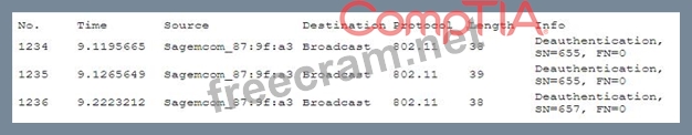 A user reports constant lag and performance issues with the wireless network when working at a local coffee shop. A security analyst walks the user through an installation of Wireshark and get a five-minute pcap to analyze. The analyst observes the following output: