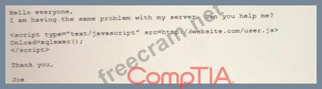 Which of the following BEST describes the attack that was attempted against the forum readers?