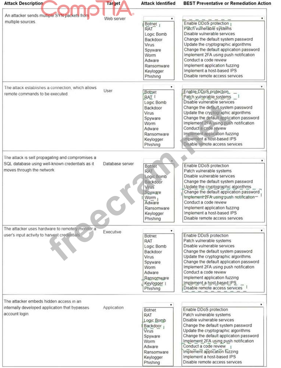 Select the appropriate attack and remediation from each drop-down list to label the corresponding attack with its remediation.