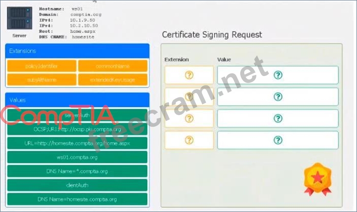 Drag the various data points to the correct locations within the CSR. Extension criteria belong in the let hand column and values belong in the corresponding row in the right hand column.