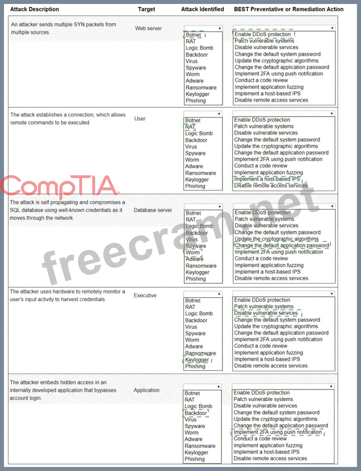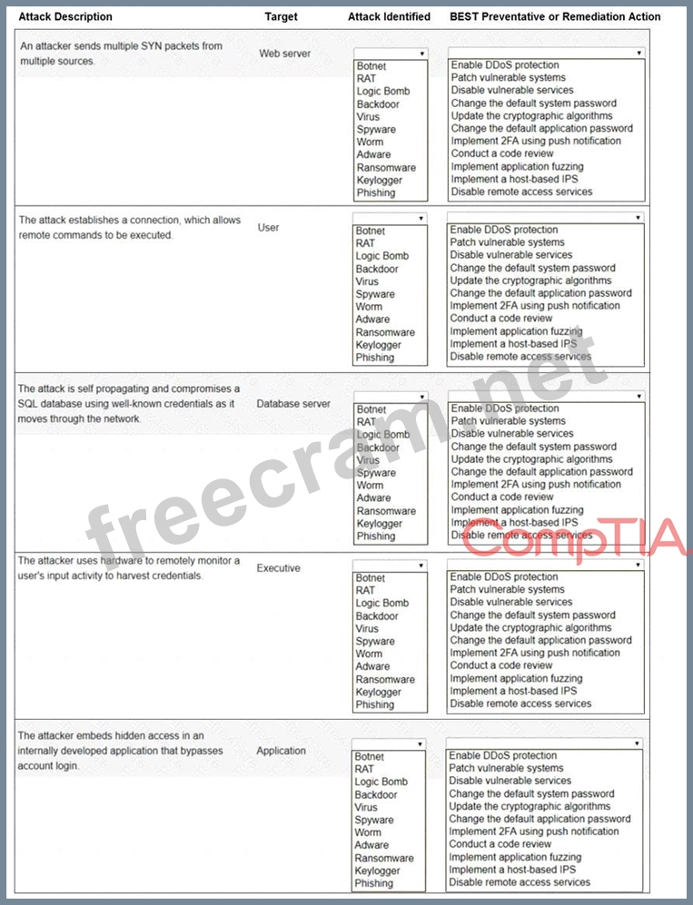 Select the appropriate attack and remediation from each drop-down list to label the corresponding attack with its remediation.