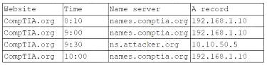 Explanation The log entry shows the IP address for "www.example.com" being changed to a different IP address, which is likely the result of DNS poisoning. DNS poisoning occurs when an attacker is able to change the IP address associated with a domain name in a DNS server's cache, causing clients to connect to the attacker's server instead of the legitimate server. References: CompTIA Security+ SY0-601 Exam Objectives: 3.2 Given a scenario, implement secure network architecture concepts.