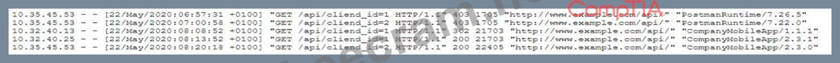 A security analyst is investigating a report from a penetration test. During the penetration test, consultants were able to download sensitive data from a back-end server. The back-end server was exposing an API that should have only been available from the company's mobile application. After reviewing the back-end server logs, the security analyst finds the following entries: