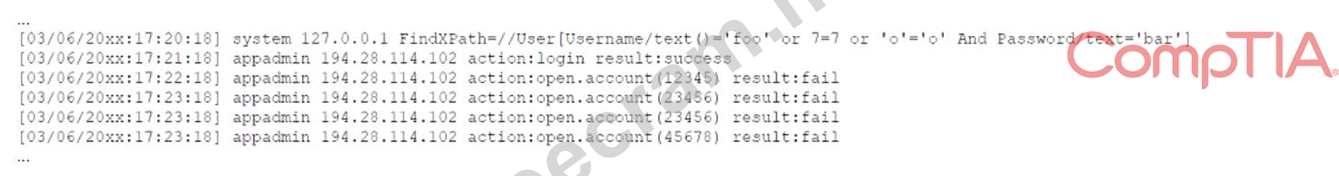 Explanation A replay attack is a type of network attack where an attacker captures and retransmits a valid data transmission, such as a login request, to gain unauthorized access or impersonate a legitimate user. In this case, the attacker may have captured the credentials of the app admin test account and used them to log in to the application. The application log shows multiple failed login attempts from different IP addresses, which indicates a replay attack.