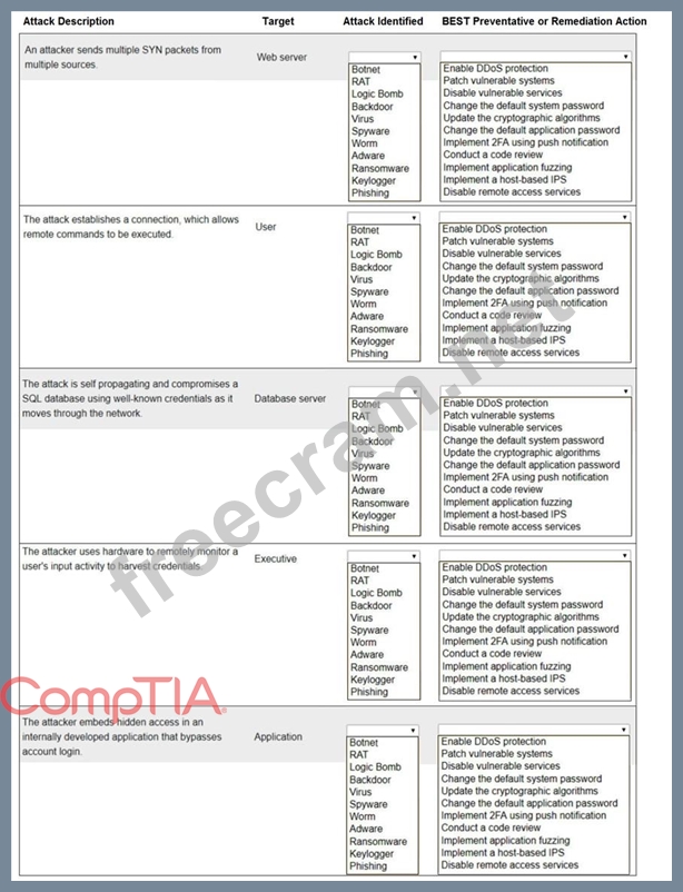 Explanation: Web serverBotnet Enable DDoS protectionUser RAT Implement a host-based IPSDatabase server Worm Change the default application passwordExecutive KeyloggerDisable vulnerable servicesApplication Backdoor Implement 2FA using push notification