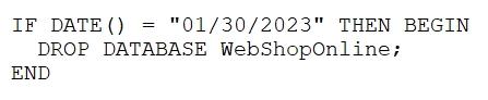 The code provided (DROP DATABASE WebShopOnline) suggests that the database was deliberately dropped on a specific date (January 30, 2023). This could potentially be the result of a command injection attack, where an attacker inserts malicious code to manipulate or destroy the database.