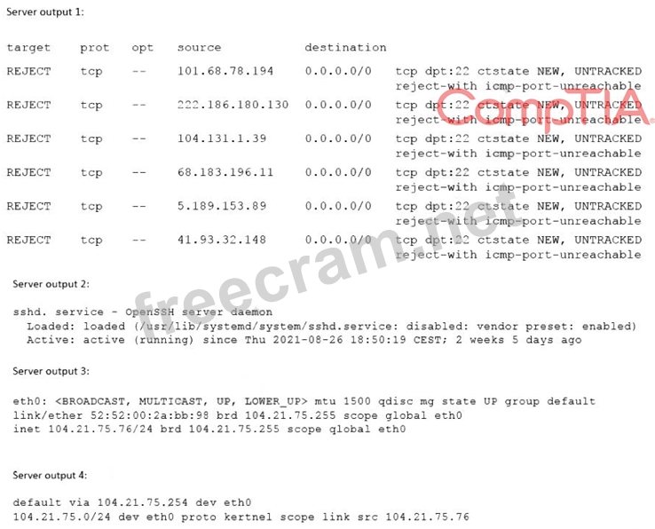 [email protected] shows that the connection is refused by the server. To resolve the issue, the administrator needs to allow port 22 on the firewall. The other options are incorrect because they are not supported by the outputs. The workstation has the correct IP settings, as shown by the output of ip addr show. The sshd service is enabled and running, as shown by the output of systemct1 status sshd. The server has the correct default gateway configuration, as shown by the output of ip route show. Reference: CompTIA Linux+ (XK0-005) Certification Study Guide, Chapter 13: Managing Network Services, pages 406-407.
