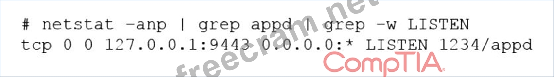 The server is in a "Listen" state on port 9943 using its loopback address. The "1234" is a process-id The cause of the issue is that the application is listening on the loopback interface. The loopback interface is a virtual network interface that is used for internal communication within the system. The loopback interface has the IP address 127.0.0.1, which is also known as localhost. The netstat output shows that the application is listening on port 9443 using the IP address 127.0.0.1. This means that the application can only accept connections from the same system, not from other systems on the network. This can prevent the users from reaching the application and cause the issue. The administrator should configure the application to listen on the IP address 0.0.0.0, which means all available interfaces, or on the specific IP address of the system that is reachable from the network. This will allow the application to accept connections from other systems and resolve the issue. The cause of the issue is that the application is listening on the loopback interface. This is the correct answer to the question. The other options are incorrect because they are not supported by the outputs. The IP address 0.0.0.0 is valid and means all interfaces, the application is not listening on port 1234, and the application is running as shown by the process ID 1234. Reference: CompTIA Linux+ (XK0-005) Certification Study Guide, Chapter 12: Managing Network Connections, page 383.