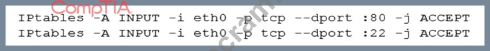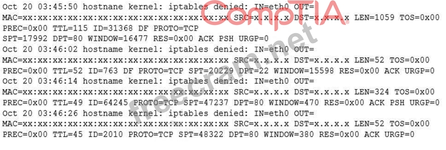Some servers in an organization have been compromised. Users are unable to access to the organization's web page and other services. While reviewing the system log, a systems administrator notices messages from the kernel regarding firewall rules: