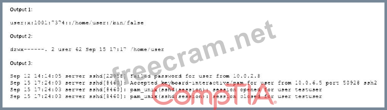 The user has the wrong shell assigned to the account, which is causing the issue. The output 1 shows that the user's shell is set to /bin/false, which is not a valid shell and will prevent the user from logging in. The output 2 shows that the user's home directory has the correct permissions (drwxr-xr-x), and the output 3 shows that the user entered the correct password and was accepted by the SSH daemon, but the session was closed immediately due to the invalid shell. The other options are incorrect because they are not supported by the outputs. Reference: CompTIA Linux+ (XK0-005) Certification Study Guide, Chapter 13: Managing Network Services, page 413.