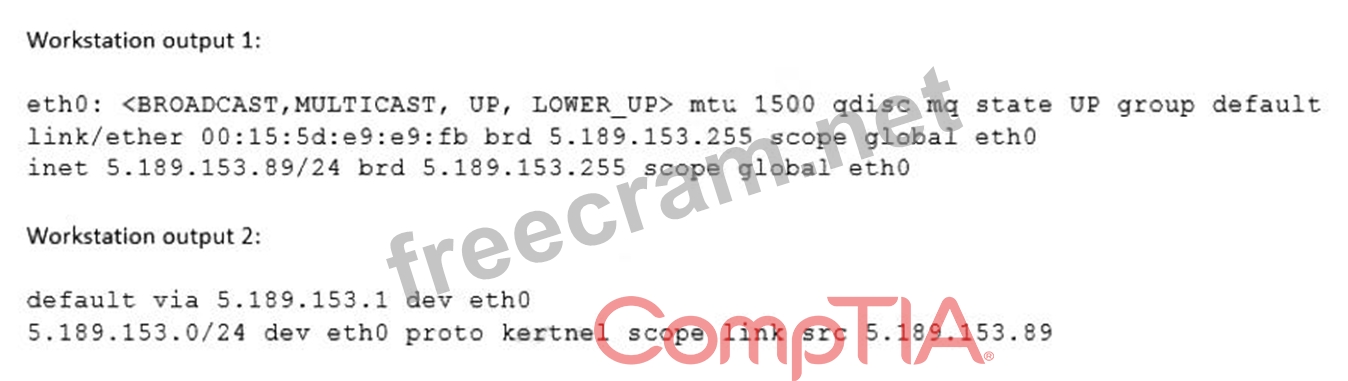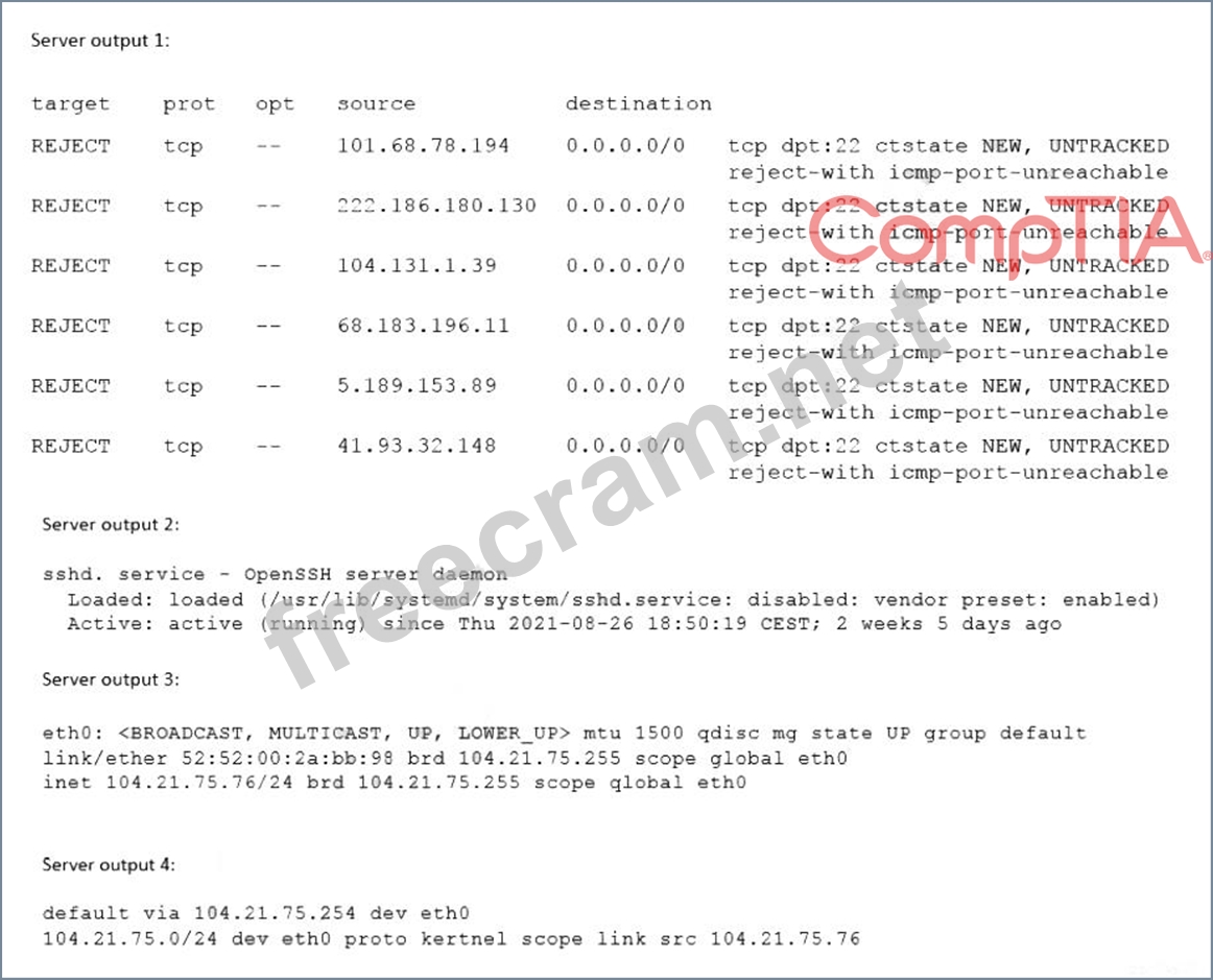 [email protected] shows that the connection is refused by the server. To resolve the issue, the administrator needs to allow port 22 on the firewall. The other options are incorrect because they are not supported by the outputs. The workstation has the correct IP settings, as shown by the output of ip addr show. The sshd service is enabled and running, as shown by the output of systemct1 status sshd. The server has the correct default gateway configuration, as shown by the output of ip route show. References: CompTIA Linux+ (XK0-005) Certification Study Guide, Chapter 13: Managing Network Services, pages 406-407.