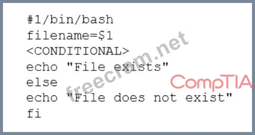 A user is asking the systems administrator for assistance with writing a script to verify whether a file exists. Given the following: Which of the following commands should replace the <CONDITIONAL> string?
