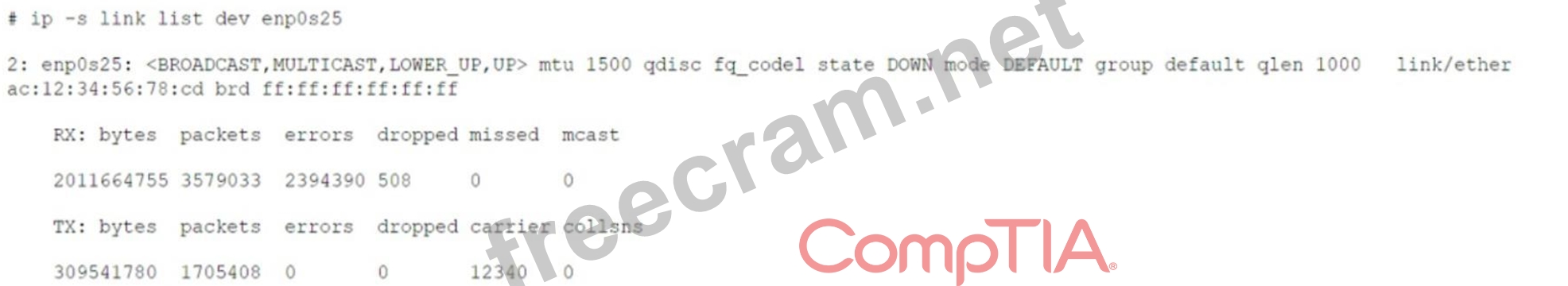 The high number of errors and dropped packets in the output of the network interface counters indicate a connection problem on the network interface. References: * CompTIA Linux+ (XK0-005) Certification Study Guide, Chapter 10: Managing Networking, Section: Troubleshooting Network Issues, Page 359. * Linux+ (Plus) Certification, Exam Objectives: 4.3 Given a scenario, troubleshoot and resolve basic network configuration and connectivity issues.