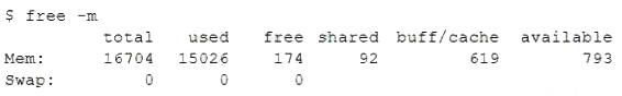 Based on the output of the image sent by the user, the system requires more swap space to allow for spikes in usage during peak hours and prevent the Java process from stopping due to a lack of memory. The output shows that there is only 0 MB of swap space available on the system, which means that there is no room for swapping out memory pages when physical memory is full or low. The output also shows that there is only 793 MB of available memory on the system, which may not be enough to handle high-demand applications such as Java. This may cause Java to stop working due to insufficient memory or trigger an OutOfMemoryError exception. Configuring more swap space on the system would help to alleviate this issue by providing more virtual memory for applications and improving performance. Configuring memory allocation policies during business hours will not help to solve this issue, as it will not increase the amount of available memory or swap space on the system. Configuring a different nice value for Java process will not help to solve this issue, as it will only affect its scheduling priority, not its memory consumption or allocation. Configuring more CPU cores will not help to solve this issue, as it will only increase processing power, not memory capacity or availability. Reference: CompTIA Linux+ (XK0-005) Certification Study Guide, Chapter 15: Managing Memory and Process Execution, page 468.