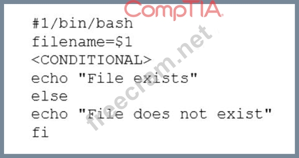 A user is asking the systems administrator for assistance with writing a script to verify whether a file exists. Given the following: Which of the following commands should replace the <CONDITIONAL> string?