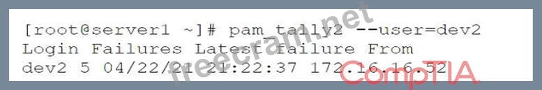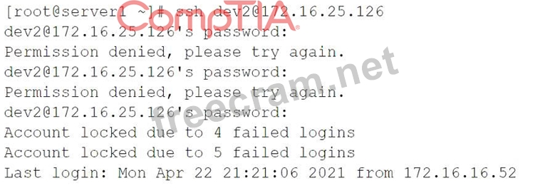 To unlock an account that has been locked due to login failures, the administrator can use the command pam_tally2 --user=dev2 --reset (D). This will reset the failure counter for the user "dev2" and allow the user to log in again. The other commands will not unlock the account, but either display or increase the failure count. References: * [CompTIA Linux+ Study Guide], Chapter 4: Managing Users and Groups, Section: Locking Accounts with pam_tally2 * [How to Lock and Unlock User Account in Linux]