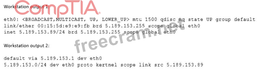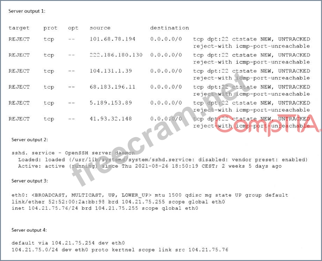 [email protected] shows that the connection is refused by the server. To resolve the issue, the administrator needs to allow port 22 on the firewall. The other options are incorrect because they are not supported by the outputs. The workstation has the correct IP settings, as shown by the output of ip addr show. The sshd service is enabled and running, as shown by the output of systemct1 status sshd. The server has the correct default gateway configuration, as shown by the output of ip route show. References: CompTIA Linux+ (XK0-005) Certification Study Guide, Chapter 13: Managing Network Services, pages 406-407.