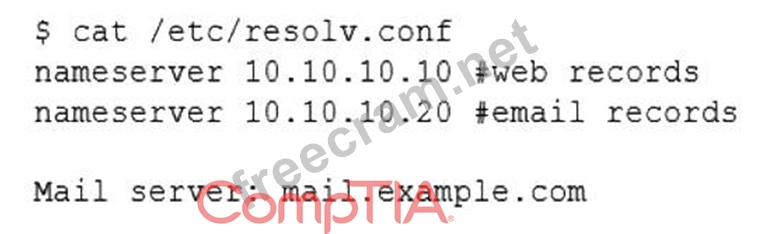 A Linux engineer set up two local DNS servers (10.10.10.10 and 10.10.10.20) and was testing email connectivity to the local mail server using the mail command on a local machine when the following error appeared: The local machine DNS settings are: Which of the following commands could the engineer use to query the DNS server to get mail server information?