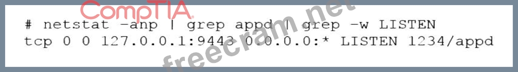 The server is in a "Listen" state on port 9943 using its loopback address. The "1234" is a process-id The cause of the issue is that the application is listening on the loopback interface. The loopback interface is a virtual network interface that is used for internal communication within the system. The loopback interface has the IP address 127.0.0.1, which is also known as localhost. The netstat output shows that the application is listening on port 9443 using the IP address 127.0.0.1. This means that the application can only accept connections from the same system, not from other systems on the network. This can prevent the users from reaching the application and cause the issue. The administrator should configure the application to listen on the IP address 0.0.0.0, which means all available interfaces, or on the specific IP address of the system that is reachable from the network. This will allow the application to accept connections from other systems and resolve the issue. The cause of the issue is that the application is listening on the loopback interface. This is the correct answer to the question. The other options are incorrect because they are not supported by the outputs. The IP address 0.0.0.0 is valid and means all interfaces, the application is not listening on port 1234, and the application is running as shown by the process ID 1234. References: CompTIA Linux+ (XK0-005) Certification Study Guide, Chapter 12: Managing Network Connections, page 383.