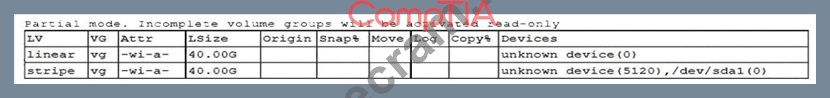 One leg of an LVM-mirrored volume failed due to the underlying physical volume, and a systems administrator is troubleshooting the issue. The following output has been provided: