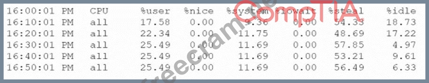 Based on the output from one of the affected systems, the best explanation for the reported issue is that the virtual machine is running out of CPU resources, leading to users experiencing longer response times (D). The output shows that the system use percentage is very high (57.85%), indicating that the virtual machine is using most of its CPU cycles for system processes. This leaves little CPU time for user processes, which results in slower performance. The other explanations are not supported by the output or are contradictory. Reference: [CompTIA Linux+ Study Guide], Chapter 8: Optimizing Linux Performance, Section: Monitoring CPU Usage [How to Interpret CPU Usage Statistics]