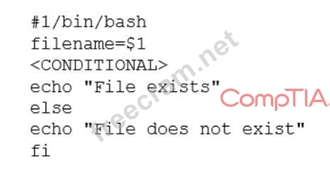 A user is asking the systems administrator for assistance with writing a script to verify whether a file exists. Given the following: Which of the following commands should replace the <CONDITIONAL> string?
