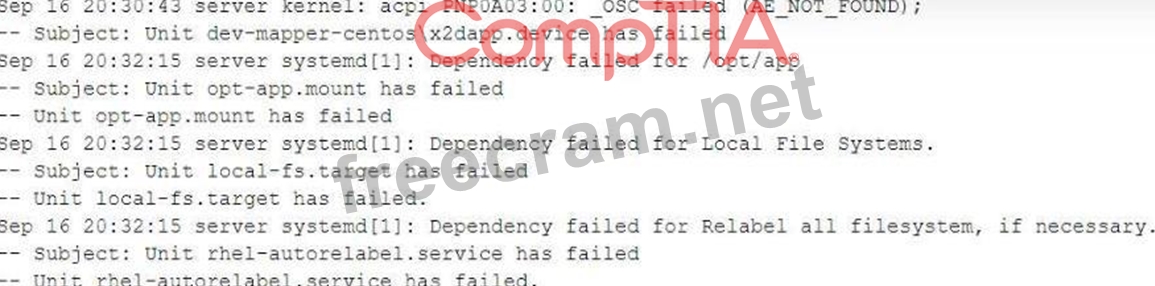 A systems administrator is investigating an issue in which one of the servers is not booting up properly. The journalctl entries show the following: Which of the following will allow the administrator to boot the Linux system to normal mode quickly?