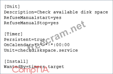A Linux administrator is scheduling a system job that runs a script to check available disk space every hour. The Linux administrator does not want users to be able to start the job. Given the following: The Linux administrator attempts to start the timer service but receives the following error message: Which of the following is MOST likely the reason the timer will not start?