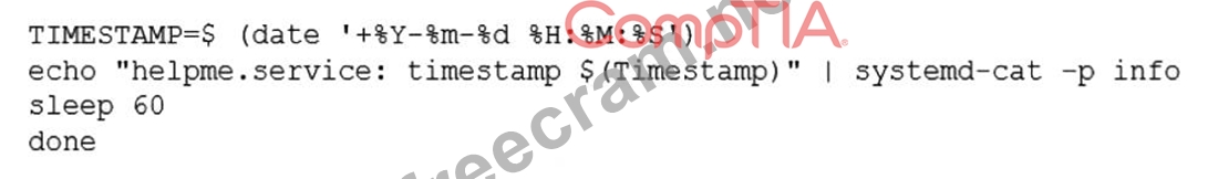 The administrator should do the following two things to address the issue: Add #!/bin/bash to the top of the script. This is called a shebang line and it tells the system which interpreter to use to execute the script. Without this line, the script will not run properly. The shebang line should be the first line of the script and should start with #! followed by the path to the interpreter. In this case, the interpreter is bash and the path is /bin/bash. The other option (A) is incorrect because the shebang line should be at the top, not the bottom of the script. Create a unit file for the new service in /etc/systemd/system/ with the name helpme.service in the location. This is necessary to register the script as a systemd service and enable it to run at startup. A unit file is a configuration file that defines the properties and behavior of a service, such as the description, dependencies, start and stop commands, and environment variables. The unit file should have the extension .service and should be placed in the /etc/systemd/system/ directory. The other option (E) is incorrect because /etc/init.d is the directory for init scripts, not systemd services. References: CompTIA Linux+ (XK0-005) Certification Study Guide, Chapter 14: Managing Processes and Scheduling Tasks, pages 429-430.