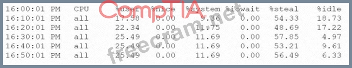 Based on the output from one of the affected systems, the best explanation for the reported issue is that the virtual machine is running out of CPU resources, leading to users experiencing longer response times (D). The output shows that the system use percentage is very high (57.85%), indicating that the virtual machine is using most of its CPU cycles for system processes. This leaves little CPU time for user processes, which results in slower performance. The other explanations are not supported by the output or are contradictory. References: [CompTIA Linux+ Study Guide], Chapter 8: Optimizing Linux Performance, Section: Monitoring CPU Usage [How to Interpret CPU Usage Statistics]