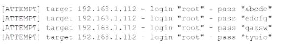 The output shows multiple login attempts with different passwords for the same username "root" on the IP address 192.168.1.112. This is indicative of a brute force attack, where an attacker systematically tries various password combinations to gain unauthorized access. References: The Official CompTIA PenTest+ Study Guide (Exam PT0-002), Chapter 4: Conducting Passive Reconnaissance; The Official CompTIA PenTest+ Student Guide (Exam PT0-002), Lesson 4: Conducting Active Reconnaissance.