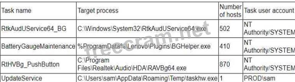 A threat hunter seeks to identify new persistence mechanisms installed in an organization's environment. In collecting scheduled tasks from all enterprise workstations, the following host details are aggregated: Which of the following actions should the hunter perform first based on the details above?
