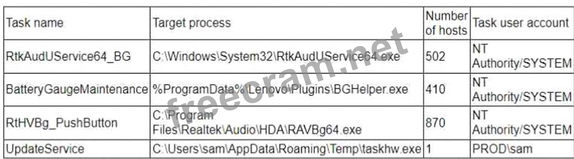 A threat hunter seeks to identify new persistence mechanisms installed in an organization's environment. In collecting scheduled tasks from all enterprise workstations, the following host details are aggregated: Which of the following actions should the hunter perform first based on the details above?