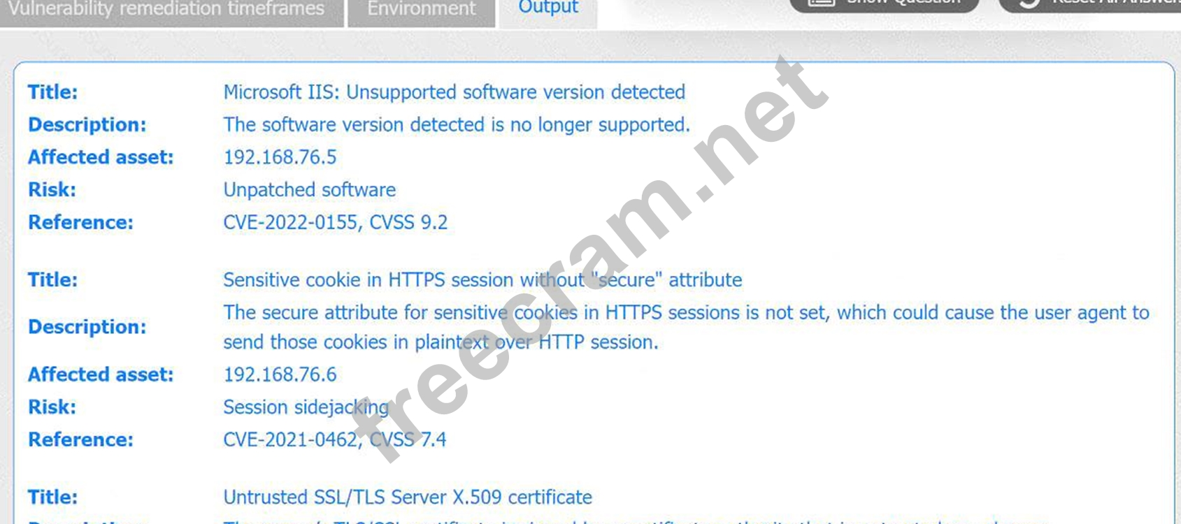 * Server 192.168.76.6 has a CVSS score of 7.4 for a missing secure attribute on HTTPS cookies, which falls in the 5.0 - 7.9 range, requiring a patch within 30 days.