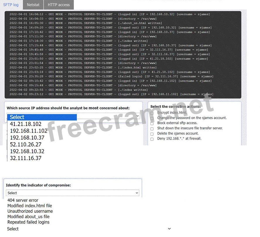 * answer: 41.21.18.102 should be the IP of concern due to its direct file modifications on critical web files (about_us.html, index.html).