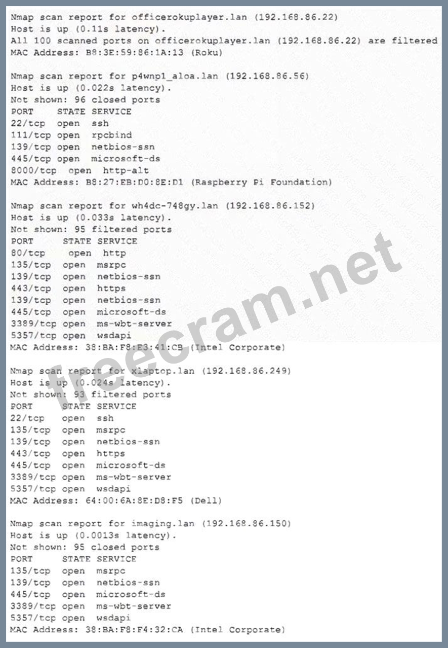 Due to reports of unauthorized activity that was occurring on the internal network, an analyst is performing a network discovery. The analyst runs an Nmap scan against a corporate network to evaluate which devices were operating in the environment. Given the following output: Which of the following choices should the analyst look at first?