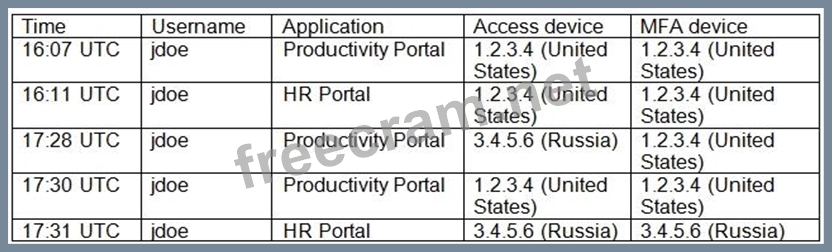 Impossible geo-velocity: This is an event where a single user's account is accessed from different geographical locations within a timeframe that is impossible for normal human travel. In the log, we can see that the user "jdoe" is accessing from the United States and then within a few minutes from Russia, which is practically impossible to achieve without the use of some form of automated system or if the account credentials are being used by different individuals in different locations. Push phishing: This could also be an indication of push phishing, where the user is tricked into approving a multi-factor authentication request that they did not initiate. This is less clear from the logs directly, but it could be inferred if the user is receiving MFA requests that they are not initiating and are being approved without their genuine desire to access the resources.