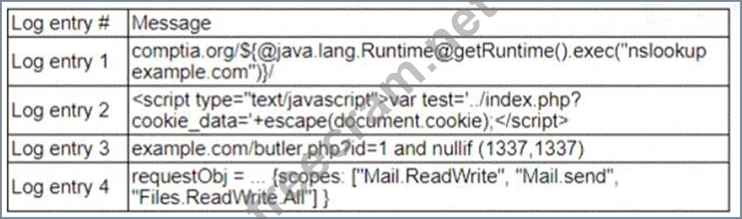 A zero-day command injection vulnerability was published. A security administrator is analyzing the following logs for evidence of adversaries attempting to exploit the vulnerability: Which of the following log entries provides evidence of the attempted exploit?
