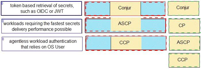 Explanation The appropriate Secrets Manager solution for each scenario is as follows: token based retrieval of secrets, such as OIDC or JWT: Conjur workloads requiring the fastest secrets delivery performance possible: ASCP agentless workload authentication that relies on OS User: CCP These solutions are described in the Secrets Management Tools page of the CyberArk website